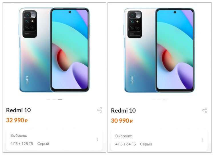 Сильно подорожал и бюджетный Redmi 10. Версия 4/64 ГБ стоит 30 990 рублей, конфигурация 4/128 ГБ обойдется покупателям в 32 990 рублей. Рост цен практически двухкратный — на релизе модель стоила 16 990 и 18 990 рублей.