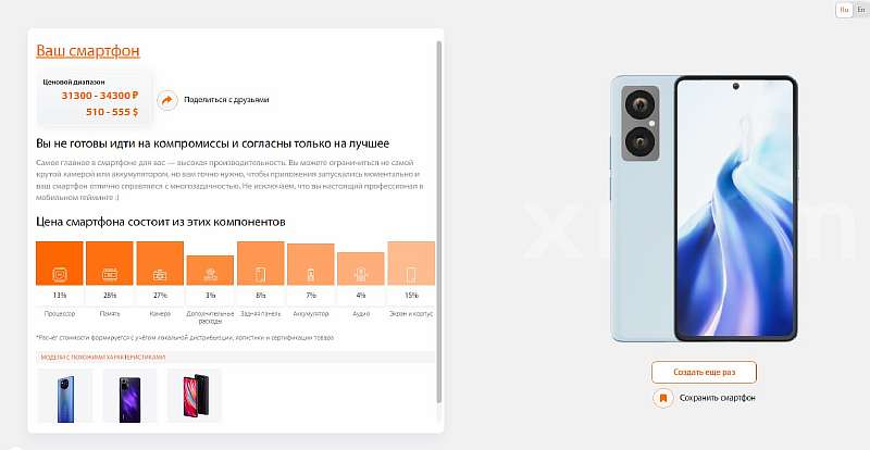 Когда все компоненты выбраны, можно запустить сборку. Конструктор продемонстрирует, каким получился дизайн устройства, а также рассчитает его приблизительный ценник с подробностями, что и во сколько именно обошлось. Очень полезный сервис, если вы собираетесь покупать смартфон в ближайшем будущем. Попробовать Xiaomi Dreams 2.0 можно по этой ссылке.
