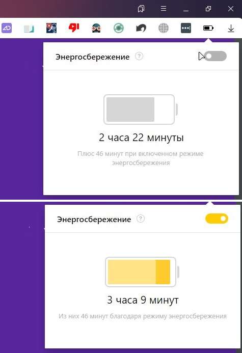 Чтобы активировать режим экономии энергии, необходимо обновить «Браузер» до версии 22.5.4 на компьютерах Windows, Mac и Linux, или до версии 22.7.0 на смартфонах Android. В правом верхнем углу появится иконка батареи – кликаем ее активируем соответствующий тумблер. Там же система показывает примерный прирост автономности, который вы получите за счет использования этой функции.