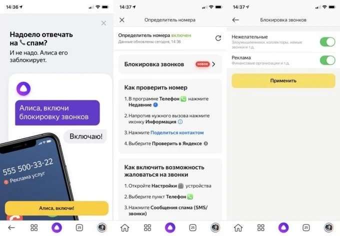 Чтобы включить новую функцию, запустите приложение «Яндекс» и скажите «Алиса, включи блокировку звонков», после чего активируйте нужные параметры в открывшемся меню. Для этого способа необходимо чтобы голосовой помощник был активен и имел доступ к микрофону.