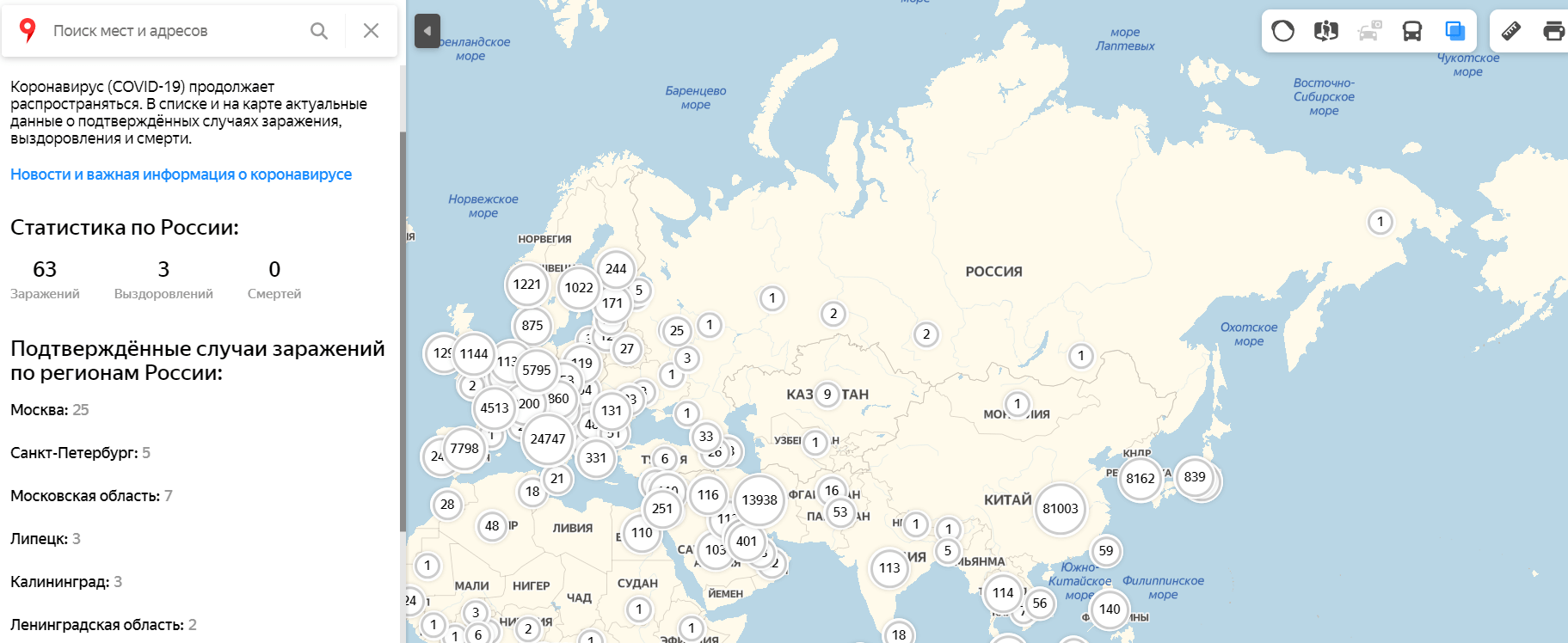 «Яндекс» создал интерактивную карту распространения коронавируса в России