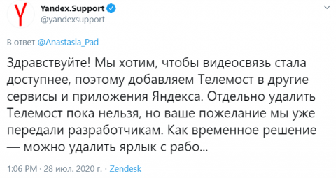 Как удалить Яндекс.Телемост: поскольку это ярлык, просто перенесите его в корзину и забудьте — никаких дополнительных файлов на компьютер Телемост не загружает.