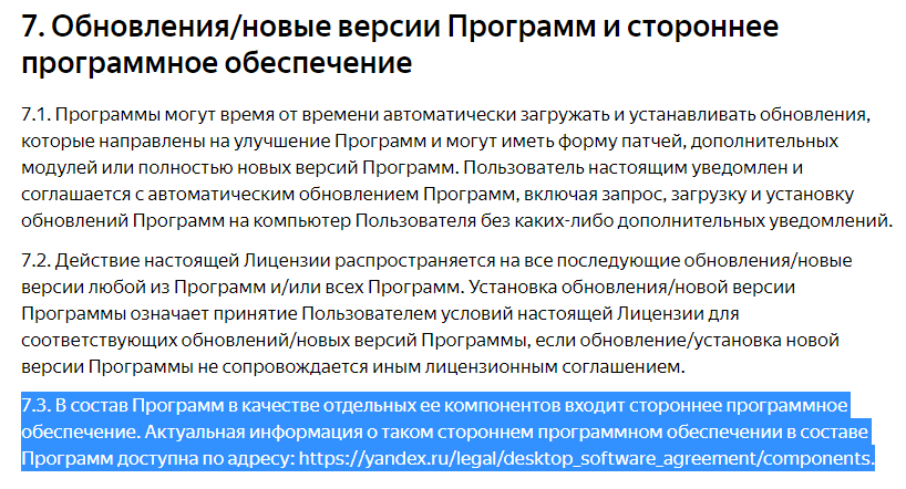 И что самое интересное: по закону — они ничего не нарушили. Если на ваш ПК установлены сервисы Яндекса (Диск, Почта, Погода, и так далее) — вы по-любому принимали Пользовательское соглашение, в котором прямо и честно написано: