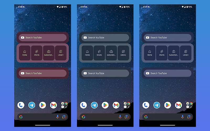 Через виджет можно быстро найти нужный ролик, перейти на главную страницу YouTube, открыть раздел Shorts с короткими видео или проверить, не вышел ли новый контент на каналах, на которые вы подписаны. Разместить виджет можно в любом месте на рабочем столе, хоть среди других виджетов, хоть среди иконок приложений. Нужно лишь выделить под него пространство 3 на 2 клетки.