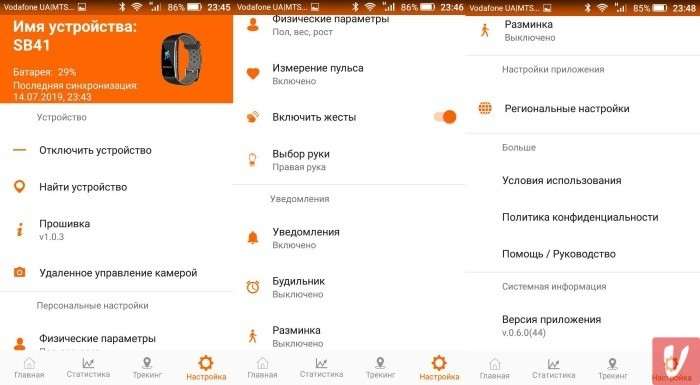 В настройках, где реализованы стандартные моменты вроде ввода физических параметров, установки будильника и напоминаний о разминке, присутствует необычная опция «Управление камерой». Она позволяет делать фотографии с помощью тапа по браслету, что определенно оценят любительницы селфи и социальных сетей.