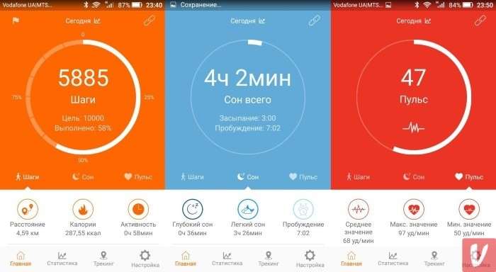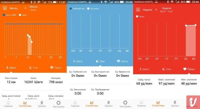 С определением сердечного ритма трекер справляется хорошо, он демонстрирует минимальную разницу с новым Бэндом как в спокойном состоянии, так и при беге. Средняя погрешность измерений с медицинским пульсометром колеблется в пределах 5-7 единиц, так что показателям браслета можно верить.