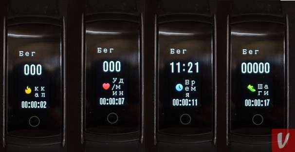 Так как экран трекера не реагирует на касания, единственным органом управления является расположенная под ним сенсорная клавиша. При коротком нажатии на кнопку происходит перелистывание пунктов меню, а длительный тап отвечает за выбор вкладки и запуск функций. Моя главная претензия к навигации – отсутствие опции «назад» как таковой. Если случайно пропускаешь нужный пункт меню приходится заново тапать до тех пор, пока все вкладки не пройдут повторно – привыкнуть можно, но это не очень удобно.