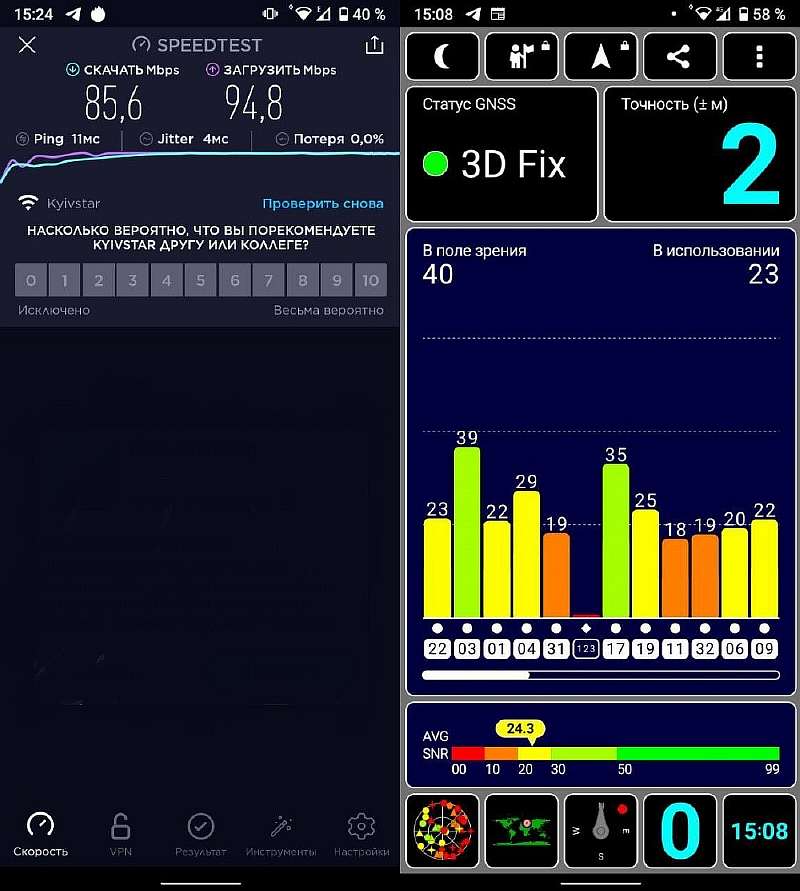 Имеется двухдиапазонный Wi-Fi, Bluetooth 4.2 и актуальные навигационные модули GPS, ГЛОНАСС и Beidou – все интерфейсы функционируют стабильно. Ниже – тест скорости интернета при подключении к Wi-Fi 100 Мбит/сек: