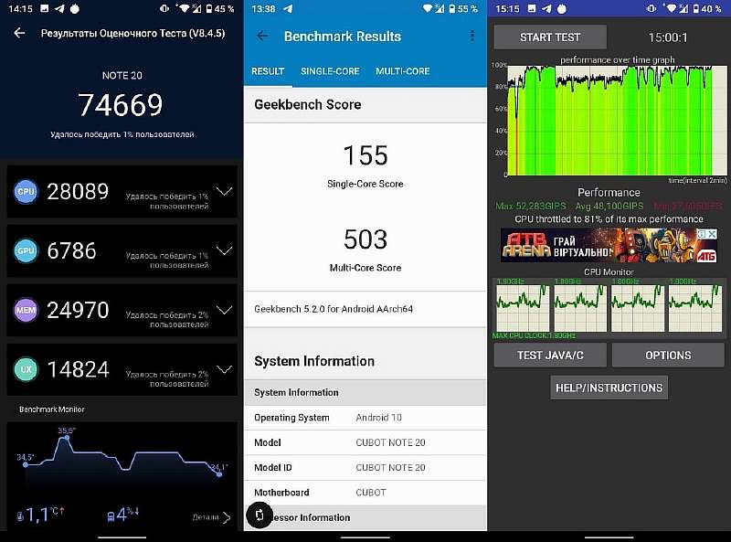 Работает Note 20 откровенно неспешно. Плавных анимаций здесь нет – микрофризы заметны как в интерфейсе, так и при прокрутке экрана в различных приложениях. Программы запускаются с задержкой в несколько секунд и частенько вылетают из фонового режима. Благо, девайс управляется чистым Android 10 и в целом система работает стабильно – никаких зависаний, вылетов приложений, перезагрузки смартфона и других критичных багов я не заметил. Если вы не привыкли к более дорогим и быстрым смартфонам, пользоваться Cubot’ом сможете без особого раздражения: ультрабюдетники других производителей на Helio A22 по быстродействию примерно такие же.