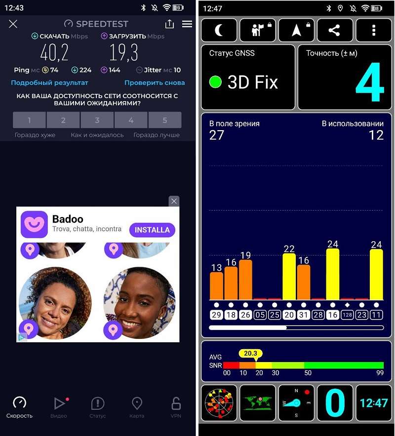Навигация на смартфоне видит 27 спутников и держит в использования более 10. Точно позиционирования – 3-4 метра. Работает стабильно.