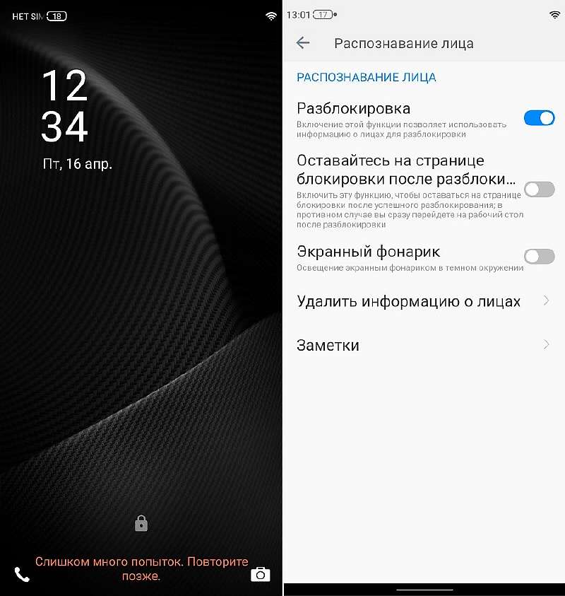 Зачастую пока достаешь телефон из кармана, происходит куча ложных срабатываний, и поднося смарт перед собой видишь бесячую надпись: «Слишком много попыток. Сканер отключен». По факту разблокировка по отпечатку пальцев здесь неюзабельная. Есть альтернатива в виде распознавания лица, но из-за слабенькой фронтальной камеры она нормально работает только при хорошем освещении. А в темное время суток и при оплате по NFC в большинстве случаев приходится по старинке разблокировать девайс паролем или графическим ключем.