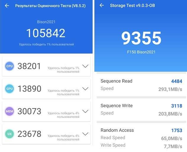 Бизон оснащен процессором начального уровня MediaTek Helio G25, который дополняется приличными для этого ценового сегмента 6 ГБ оперативной и 64 ГБ постоянной памяти. Обольщаться не стоит, память здесь медленная: оперативка – 4900 МБ/с, хранилище – 293 МБ/сек (запись), и 203 МБ/сек (чтение), поэтому быстродействием устройство особо не впечатляет. Как и все бюджетные смартфоны, B2021 неспешно запускает приложения, периодически подлагивает и «радует» фризами анимаций