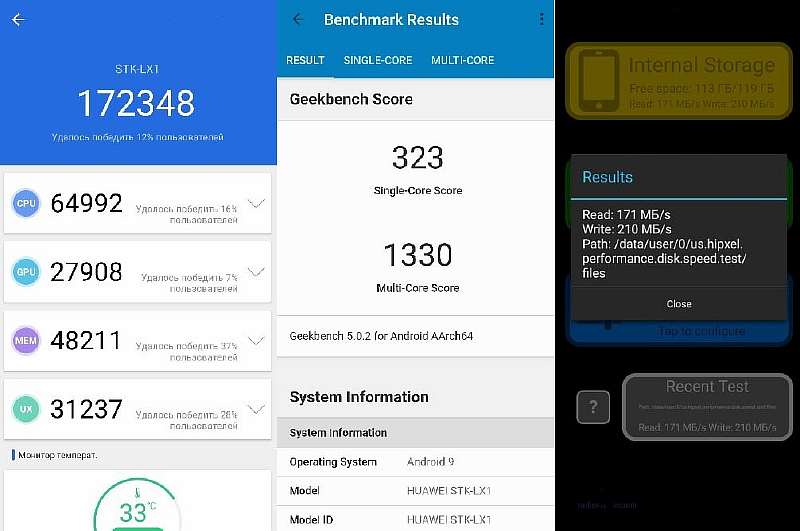 Если говорить о производительности Kirin 710F, то это все еще неплохой процессор, который обеспечивает достаточное быстродействие и плавность работы интерфейса. Вы не будете испытывать проблем с многозадачностью и сможете играть в любые игры – на каких настройках, зависит от оптимизации конкретного проекта под железо Huawei. Например, PUBG без проблем работает на 9X на средних настройках, а в CoD: Mobile для комфортной частоты кадров придется довольствоваться самым минимальным качеством графики. Хорошая новость – под нагрузкой аппарат практически не греется, корпус становится лишь слегка теплым в области камеры.