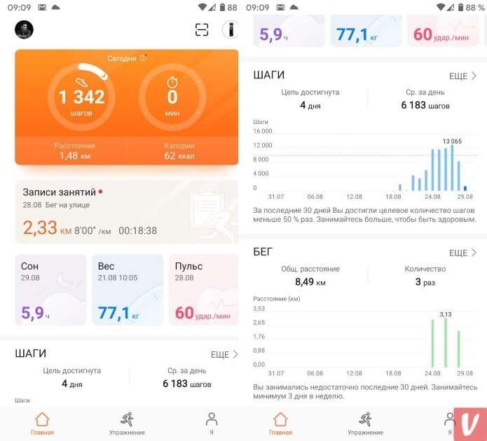 Девайс способен вести непрерывный мониторинг пульса, по итогам которого в приложении отображается статистика с наглядными графиками, включая схемы изменения ЧСС во время тренировок.