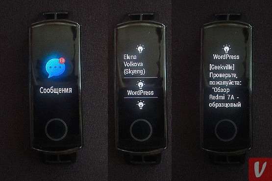 Экскурсию по интерфейсу Honor Band 5 начнем с вкладки уведомлений. Просматривать сообщения на браслете удобно, они отображаются достаточно крупным шрифтом, а при прочтении удаляются из памяти браслета, где всего может храниться до 10 непрочитанных смсок. Придраться можно только к отсутствию названий и иконок приложений, из которых поступает уведомление. Значки основных программ вроде Гугл Почты, Вайбера или Телеграмма сделали бы список более наглядным, у Xiaomi такая фишка реализована.