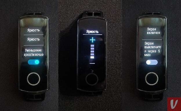 Дисплей гаджета очень яркий, даже под дневным солнцем он хорошо читается на 2-м уровне яркости из 5 доступных. Настраивать яркость можно непосредственно в меню браслета, там же включается ночной режим, в котором яркость автоматически снижается до комфортного уровня в темное время суток.