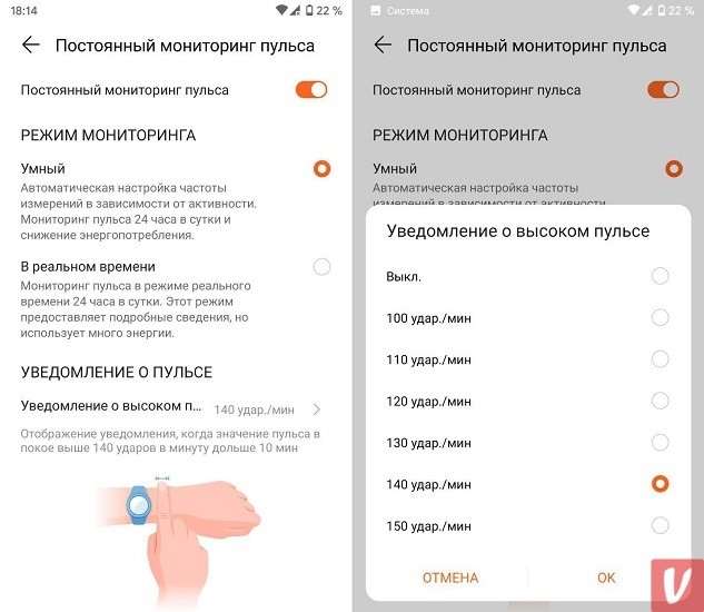При открытии вкладки пульса на браслете ЧСС выводится без задержки только если включено отслеживание в реальном времени. Если постоянный мониторинг выключен, приходится ждать 15 секунд, пока трекер осуществляет замер. Периодичность измерения пульса в фоне самостоятельно задать нельзя, доступен только «умный» режим с автоматическими замерами в зависимости от активности пользователя.