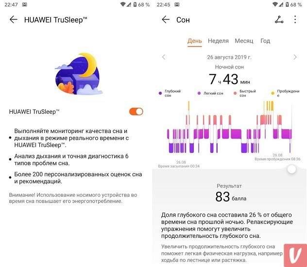 Одно из главных достоинств браслетов Huawei – фирменный алгоритм мониторинга качества сна TruSleep. Он определяет время засыпания и пробуждения, фазы сна (быстрый, легкий, глубокий), количество пробуждений, и делает это с очень высокой точностью.