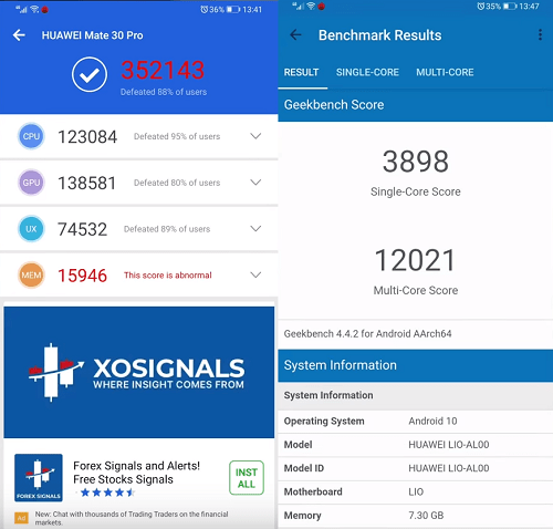 Новый 7-нанометровый процессор Kirin 990 играючи справляется с любыми задачами и не уступает в реальной производительности флагманам на топовом чипсете от Qualcomm. Mate 30 Pro демонстрирует образцовое быстродействие и тянет абсолютно любые игрушки на максимальных настройках графики. Единственное, к чему можно придраться, это то, что EMUI по-прежнему излишне агрессивно закрывает фоновые приложения, хоть недостатка в оперативной памяти смартфон не испытывает.