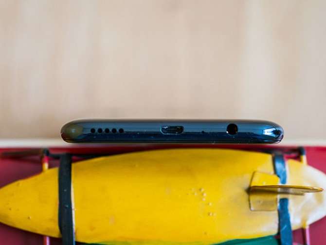 На нижнем торце корпуса расположены решетка динамика, порт Micro-USB и 3.5 мм разъем для подключения наушников. Любители симметрии будут разочарованы, так как последний сдвинут ближе к задней части корпуса, тогда как остальные элементы находятся строго по середине.