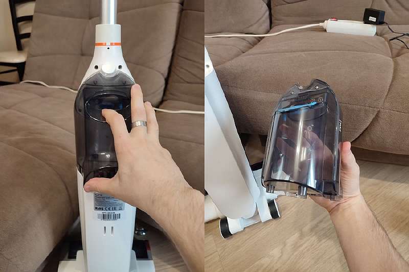 Когда пылесос заряжен, нужно залить в него воду – это верхний резервуар на 500 мл, который легко извлекается по нажатию большой кнопки. На этом все, теперь можно смело жать яркую оранжевую кнопку Power и приступать к уборке.