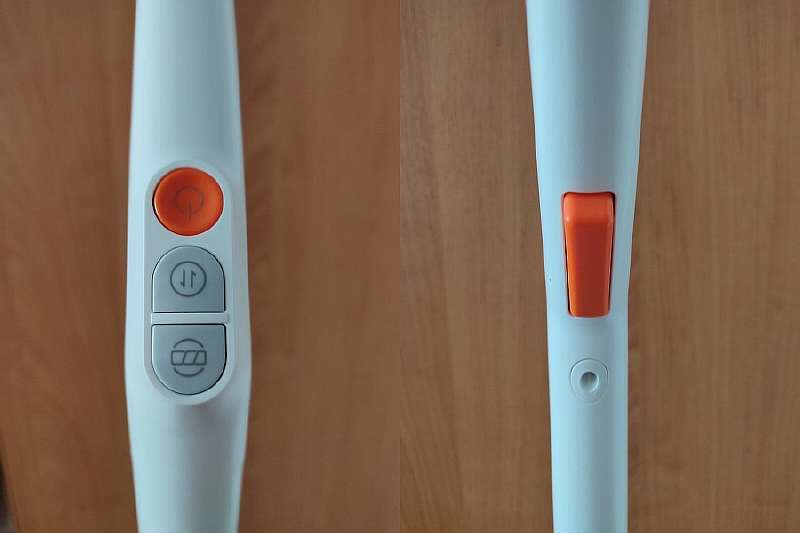 Управляется пылесос с помощью физических кнопок на ручке. Сверху их 3. Собственно, сама кнопка включения, кнопка смены режимов работы и кнопка самоочистки щетки. Снизу есть еще одна кнопка – курок, при нажатии которого на тряпку подается вода. Да, подача воды у пылесоса исключительно ручная.