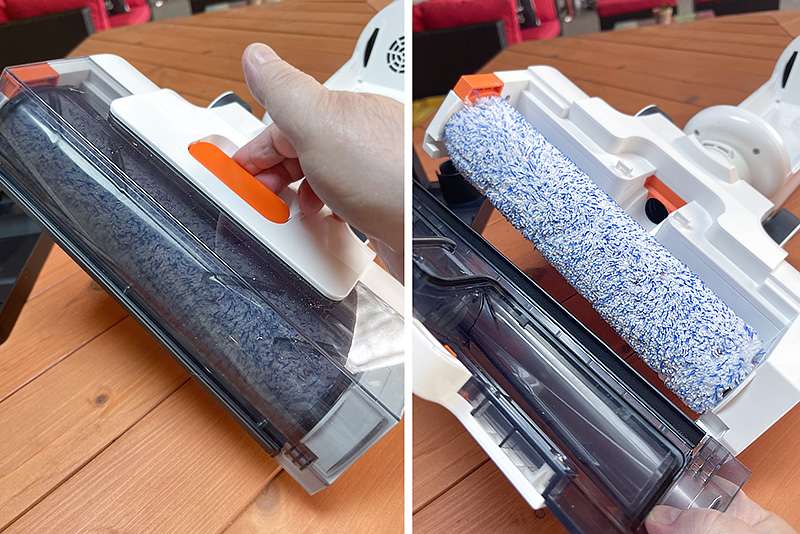 Выделяются два темных контейнера для чистой и грязной воды, которые можно извлечь, а также маленькие оранжевые акценты, отмечающие элементы управления и защелки. Металлическая у пылесоса только штанга, на которой закреплена рукоять. В сборке все смотрится качественно, современно и органично.