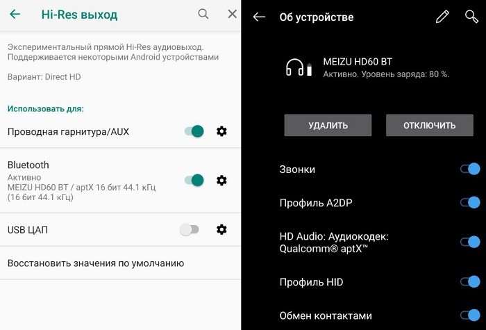 Особой разницы между качеством звука с Hi-Res выводом из Poweramp и потоковым воспроизведением со Spotify я не заметил, а вот по проводу HD60 почему-то выдают меньше баса, чем при Bluetooth подключении. Громкости в обоих случаях хватает, но без особого запаса, на улице приходится ставить 70-80%.
