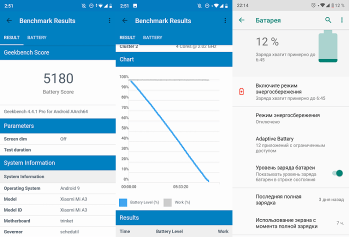 За час игры в WoT телефон теряет всего 16% аккумулятора, а непрерывно воспроизводить видео на 50% яркости экрана он может почти 21 час. В общем показатели отличные, владельцам Mi A3 не придется таскать с собой повербанк, как это часто было с предыдущим поколением.