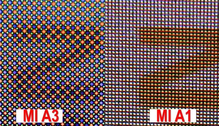 Многие владельцы смартфонов с HD экранами могут отметить, что они пользуются ими без каких-либо проблем и картинка выглядит хорошо. Но, скорее всего, в вашем устройстве установлена IPS-матрица, тогда как в AMOLED панелях используется принципиально другое расположение субпикселей (PenTile). На таких дисплеях недостаточная плотность пикселей, и связанная с ней зернистость изображения, заметны гораздо сильнее. Для наглядности ниже можно рассмотреть сравнение экранов Mi A3 и Mi A1 (FHD IPS) под микроскопом.