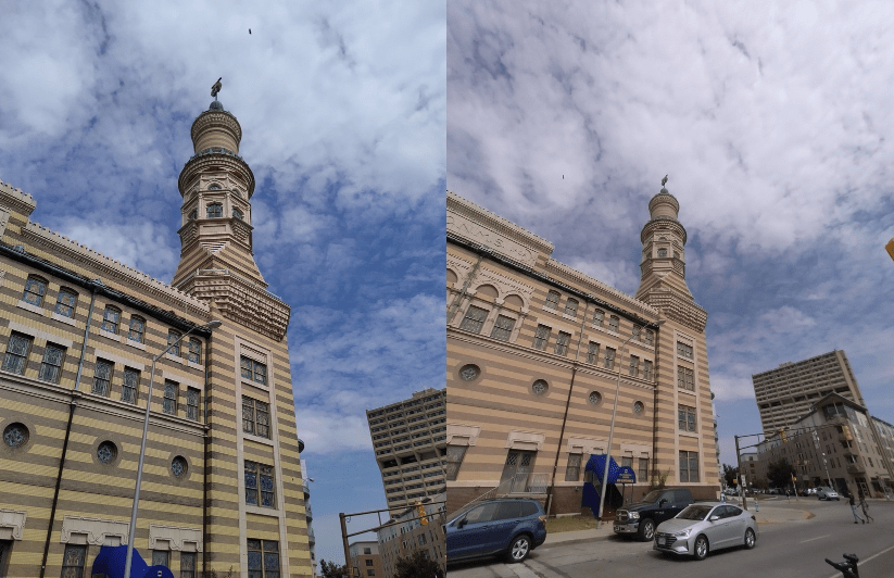 Широкоугольная камера с углом обзора 118 градусов очень интересна в использовании, она открывает новые возможности для съемки архитектуры и пейзажей. Однако качество ширика заметно хуже, чем у основного модуля. Разница заметна не только по детализации и ДД, но и по балансу белого, из-за чего снимки отличаются друг от друга цветопередачей.