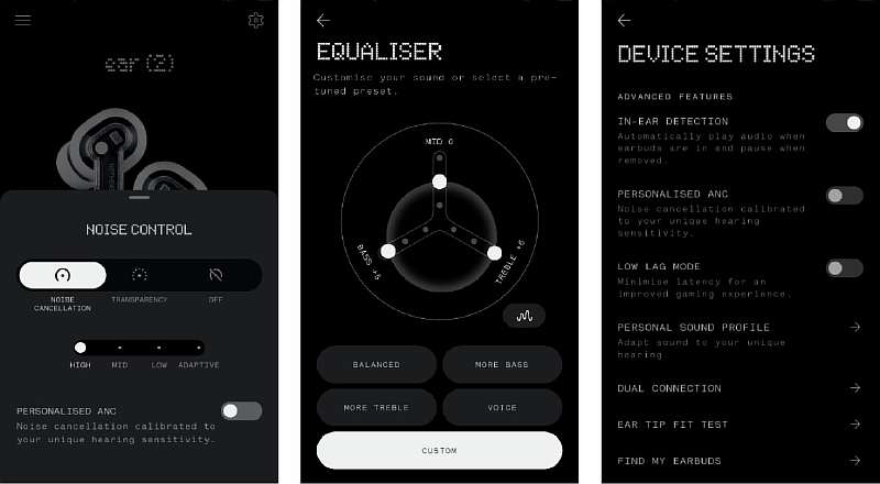 Шумодав, которым оснащен Ear (2), согласно техническим данным, способен устранить до 40 дБ внешнего шума. Он может работать в трех уровнях интенсивности и в адаптивном режиме, когда наушники сами решают, насколько им следует подавлять нежелательные звуки. Все это, конечно же, можно настроить в приложении, а также включить персонализированный ANC — тогда наушники выполнят короткое сканирование ваших ушей (это нужно делать в шумной обстановке), чтобы проверить, как вы воспринимаете шум, и будут по новому подстраиваться в адаптивном режиме.
