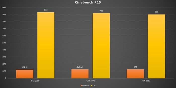 Начнем с наименее информативного теста Cinebench R15, в котором все три видеокарты демонстрируют примерно аналогичный результат, так как основная рабочая нагрузка в нем приходится на процессор.