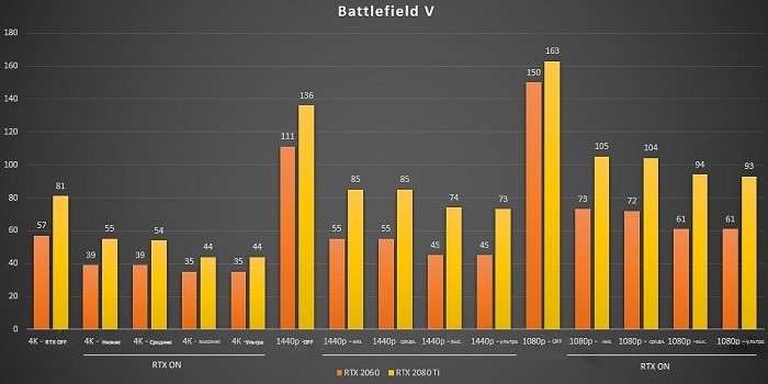 И наконец тест в Battlefield V с активной трассировкой лучей. Поскольку данная функция отсутствует в GTX 1070, сравнивать будем только представителей нового поколения – 2060 и 2080. При низком уровне рендеринга лучей RTX 2060 демонстрирует необходимые 60fps на ультрах в 1080p и вплотную приближается к ним в 2К.