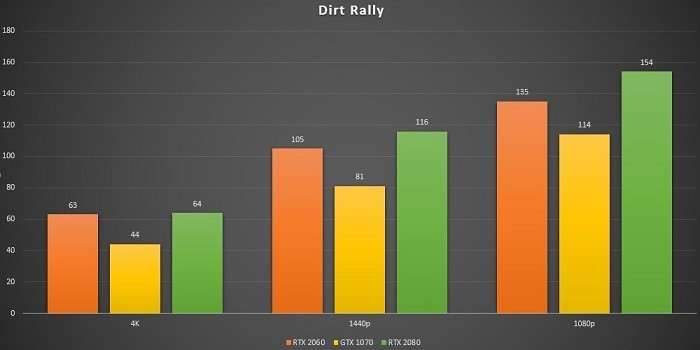Однако в играх исход сравнения RTX vs GTX однозначен, новинка демонстрирует солидное преимущество над картой прошлого поколения во всех разрешениях. Первый игровой тест пришелся на Dirt Rally, где 2060 показала результат, практически аналогичный 2080, в формате 4К.