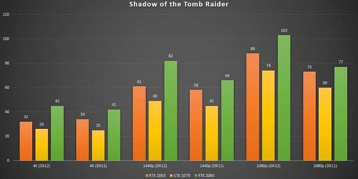 В Shadow of the Tomb Raider превосходство RTX 2060 также заметно во всех разрешениях, особенно примечателен прогресс в сравнении с 1070 при использовании DirectX 12.