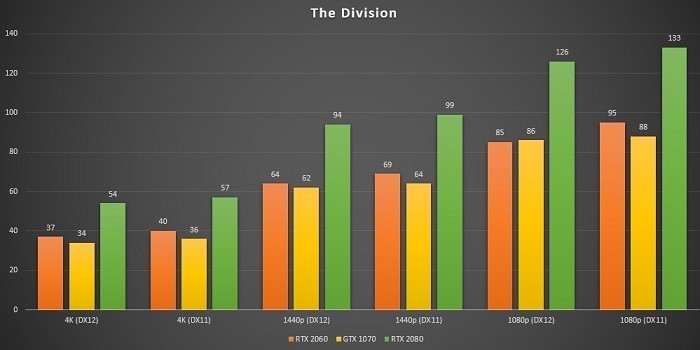 В The Division разница между 2060 и 1070 минимальная, а вот RTX 2080 демонстрирует серьезный скачок частоты кадров во всех разрешениях.