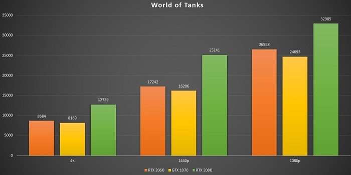 В World of Tanks (бенчмарк Encore) RTX 2060 также отрывается от 1070, особенно в FHD и 1440p формате. Но RTX 2080 опять на голову выше обоих младших моделей.