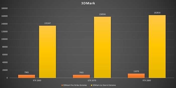 В 3DMark ситуация меняется, и тут, как ни странно, лучшие показатели у GTX 1070, которая практически догнала RTX 2080 в IceStorm.
