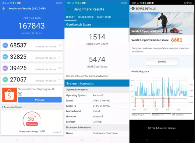Потенциальным преимуществом экрана с низким разрешением является то, что игры и другие ресурсоемкие приложения на A9 должны работать лучше, чем на смартфонах с аналогичным процессором и FHD+ матрицами, поскольку аппаратной платформе нужно обрабатывать меньше пикселей. Это подтверждают синтетические тесты, в AnTuTu Oppo A9 (2020) набирает почти 168 тыс. баллов — отличный результат для этого чипсета. Однако не стоит забывать, что в данном ценовом сегменте можно легко найти устройства на 710-м и даже 730-м Snapdragon, которые по чистой производительности оставляют A9 далеко позади.