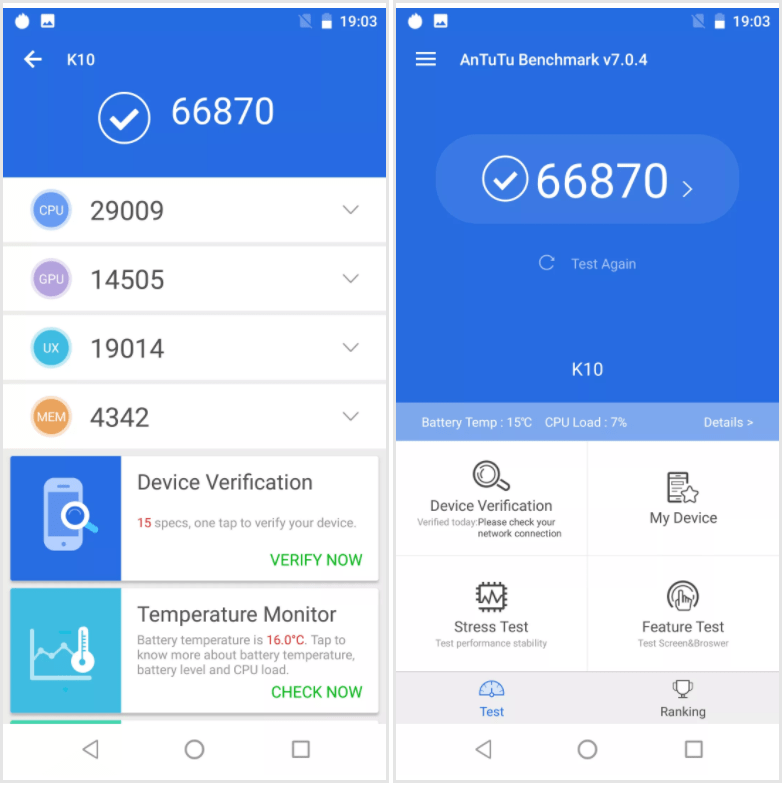 Комплектный зарядной адаптер восполняет аккумулятор K10 с нуля до 100% в среднем за 2 часа 15 минут, пиковая температура АКБ при зарядке достигает 47 градусов, но в среднем держится на отметке около 34-35С. В тесте воспроизведения FHD видео Oukitel K10 выдает рекордные 32 ч. 30 минут активного экрана, тест YEBIS 3D (непрерывное воспроизведение 3D-графики) садит батарейку за 18 ч. 26 минут. На практике разрядить смартфон даже при самой активной эксплуатации быстрее, чем за 3 дня, у вас не получится.