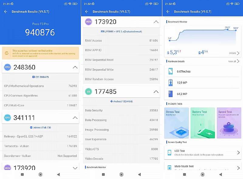 Скорость работы смартфона близка к идеалу. Все идет гладко, не нужно ждать открытия приложений, нет задержек анимации при повороте в горизонтальный режим либо возврате на рабочий стол. Высокая производительность подтверждается и результатами AnTuTu, в котором F5 Pro набирает свыше 940 000 баллов. Любые игры он тянет на максимальных настройках графики без сильно нагрева и просадок по частоте кадров в течение длительных игровых сессий.
