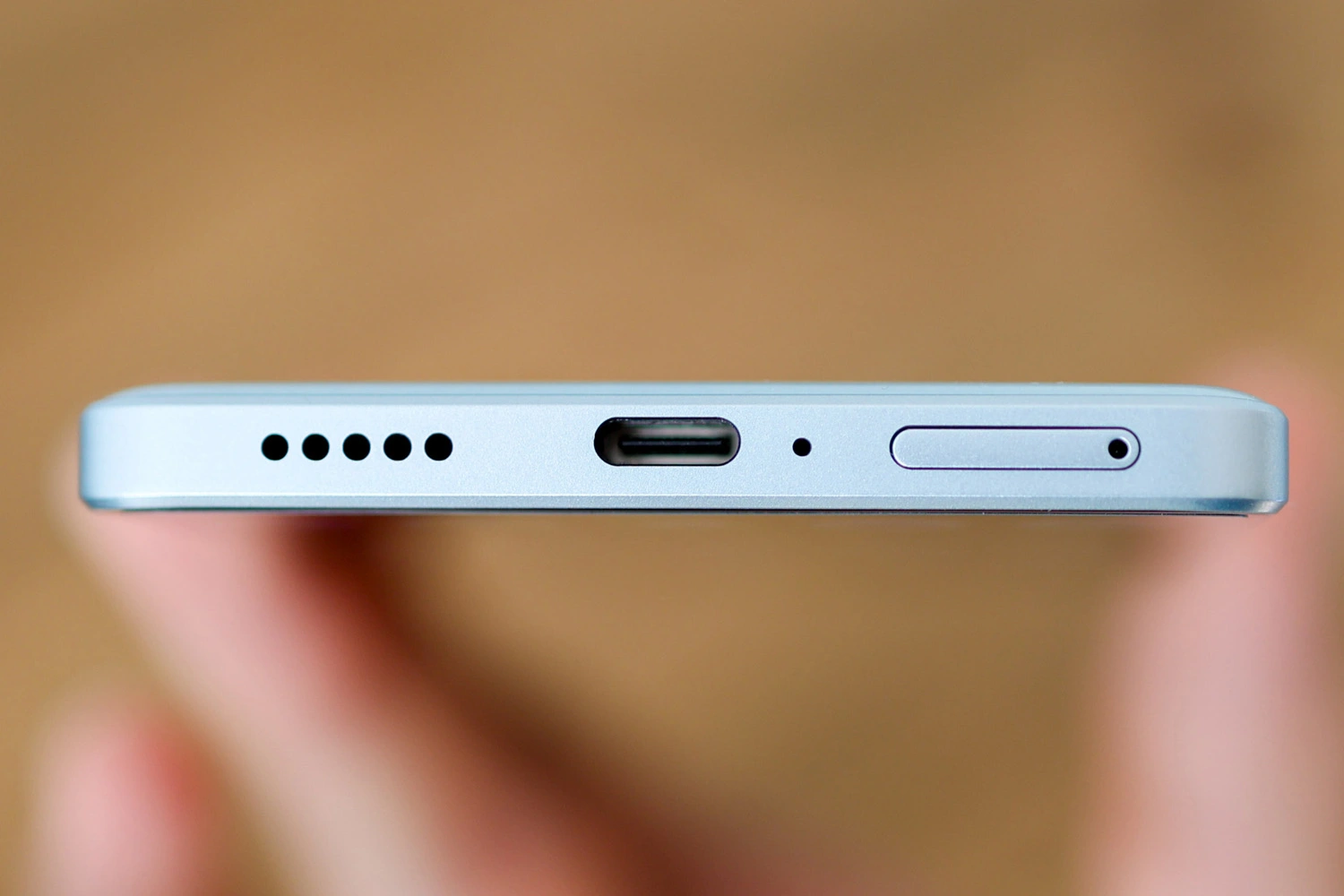 Левая сторона полностью оголена, телефон даже может стоять на ней. Внизу есть слот для двух nanoSIM, порт USB-C и решетка мультимедийного динамика. Благодаря наличию двух отдельных спикеров, стереозвук здесь полноценный, а не «полуторный». Он громкий и в меру объемный, но до флагманских устройств все равно не дотягивает.