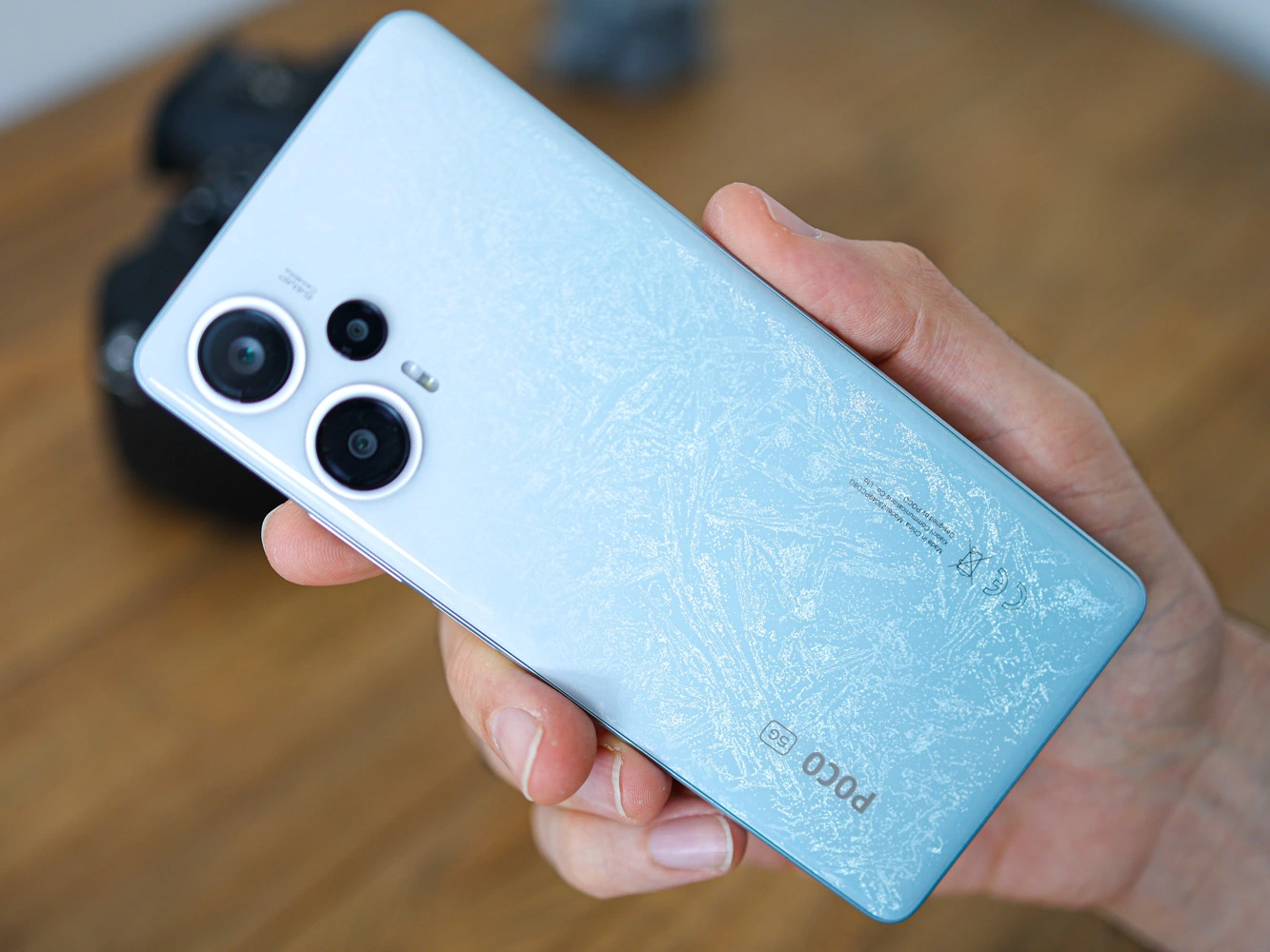 Внешне Poco F5 проходит тонкую грань между тем, чтобы выглядеть дешево и выглядеть хорошо. Он полностью копирует дизайн Redmi Note 12 Turbo, за исключением логотипа бренда сзади. Смотрится смартфон минималистично, из интересных нюансов – узор под текстуру то ли льда, то ли камня, на спинке, и рельефная металлическая окантовка вокруг объективов камеры.