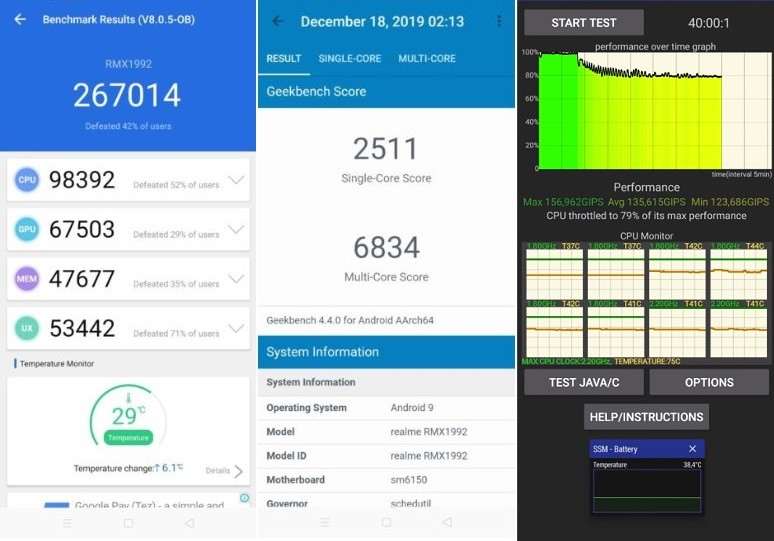 Смартфон работает на довольно мощном процессоре Snapdragon 730G, который дополнен 6 ГБ оперативной и 128 ГБ быстрой постоянной памяти UFS 2.1. Слот под карточки тут тройной, можно поставить две SIM и MicroSD одновременно. В тесте AnTuTu Realme X2 набирает 267 тыс. баллов в режиме высокой производительности – отличный показатель для среднего ценового сегмента. Однако в тесте на троттлинг не все так идеально, производительность спустя 8 мин. тестирования падает до 80%, хотя у большинства конкурентов на SD730G она не опускается ниже 90%.