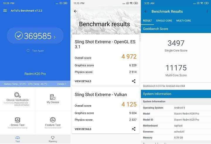 Само собой разумеется, что с таким железом K20 Pro прекрасно справляется с любыми задачами. Производительности смартфона с лихвой хватает как в играх, так и в режиме многозадачности. Скорость запуска приложений и быстродействие интерфейса, несмотря на использование памяти типа UFS 2.1 (в AndroBench смартфон набирает 798,08 МБ/с при чтении и 193.89 МБ/с при записи), находится на высоком уровне. Смартфон работает плавно, хотя изредка встречаются небольшие фризы и подлагивания, которые можно списать на оптимизацию ПО на старте продаж. Тяжелые игры вроде PUBG Mobile стабильно работают на максимальных настройках графики, нагрев корпуса под продолжительной нагрузкой не превышает 43 градуса и не сопровождается заметным троттлингом.