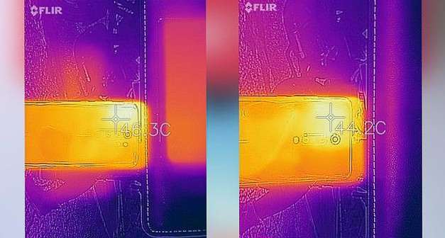 Проблема Helio G90T заключается в чрезмерном нагреве. Температура корпуса под нагрузкой растет достаточно быстро, уже спустя 10 минут в PUBG она доходит до 43 градусов, а спустя 20 минут может повышаться до 47 градусов. При этом греется корпус неравномерно, самый теплый левый верхний угол спинки, в центре температура обычно на 5 градусов меньше.