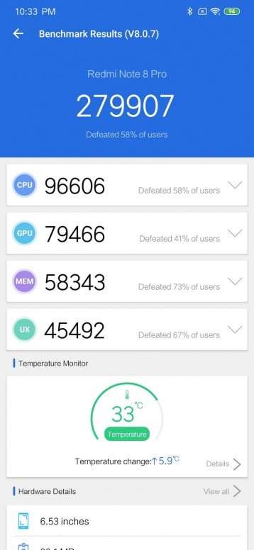 Единственным существенным недостатком новинки является поведение процессора под нагрузкой — Helio G90T мощный, но очень горячий чипсет. Xiaomi позиционирует RN8 Pro как геймерский девайс, но если вы планируете плотно рубиться в игры, на мой взгляд, лучше обратить внимание на обычный Note 8 со Snapdragon 665. Пускай он не везде потянет высокие настройки графики, зато позволит комфортно играть на протяжении длительного времени. Равнодушных к играм эта проблема волновать не должна, при стандартном использовании телефона с температурой все в порядке.