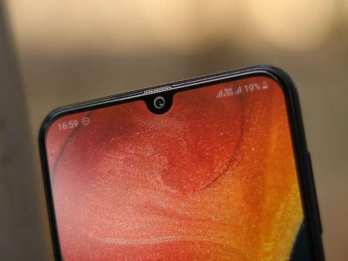 Galaxy A50 оснащен 6.4 дюймовым SuperAMOLED дисплеем с FullHD+ разрешением и соотношением сторон 19.5:9. Это экран типа Ininity-U с каплевидным вырезом под фронтальную камеру, закругленными углами и тонкими рамками, который занимает 91.6% площади лицевой панели — для устройства из среднего ценового сегмента это отличный показатель. Дисплей покрыт закаленным стеклом Gorilla Glass 3 с неплохим олеофобным покрытием.