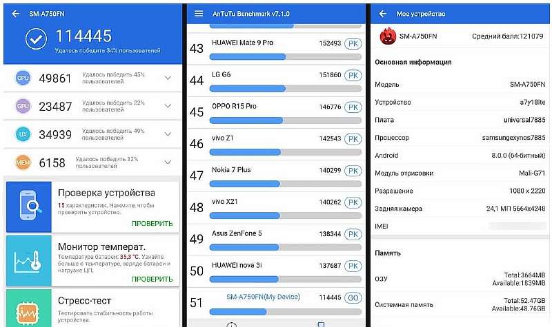 На практике недостаток мощности ощущается лишь при запуске ресурсоемких игрушек вроде PUBG, где для получения комфортной частоты кадров приходится снижать настройки графики. При выполнении повседневных задач А7 зарекомендовал себя хорошо, навигация по системе, запуск приложений, серфинг интернета и просмотр видео происходят плавно и шустро.